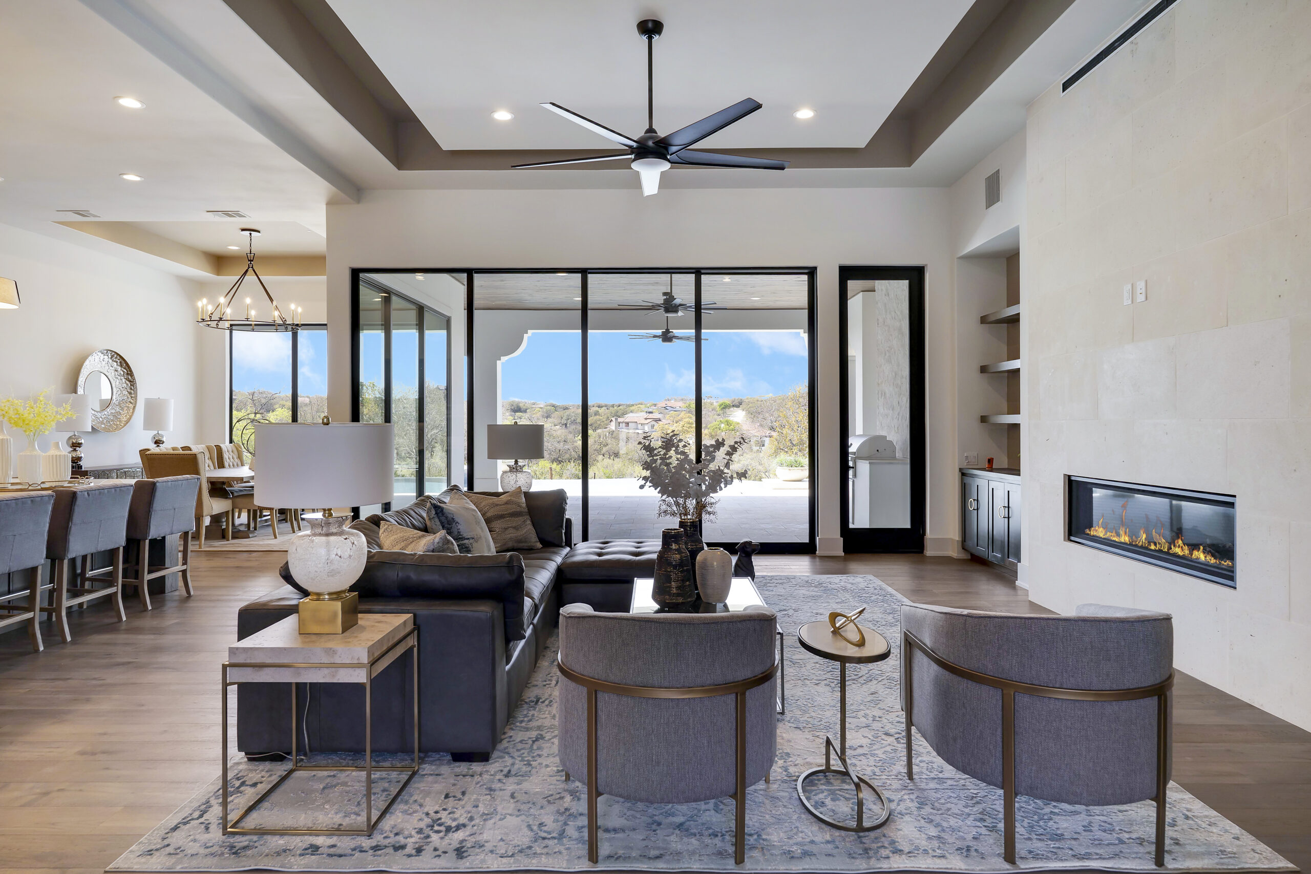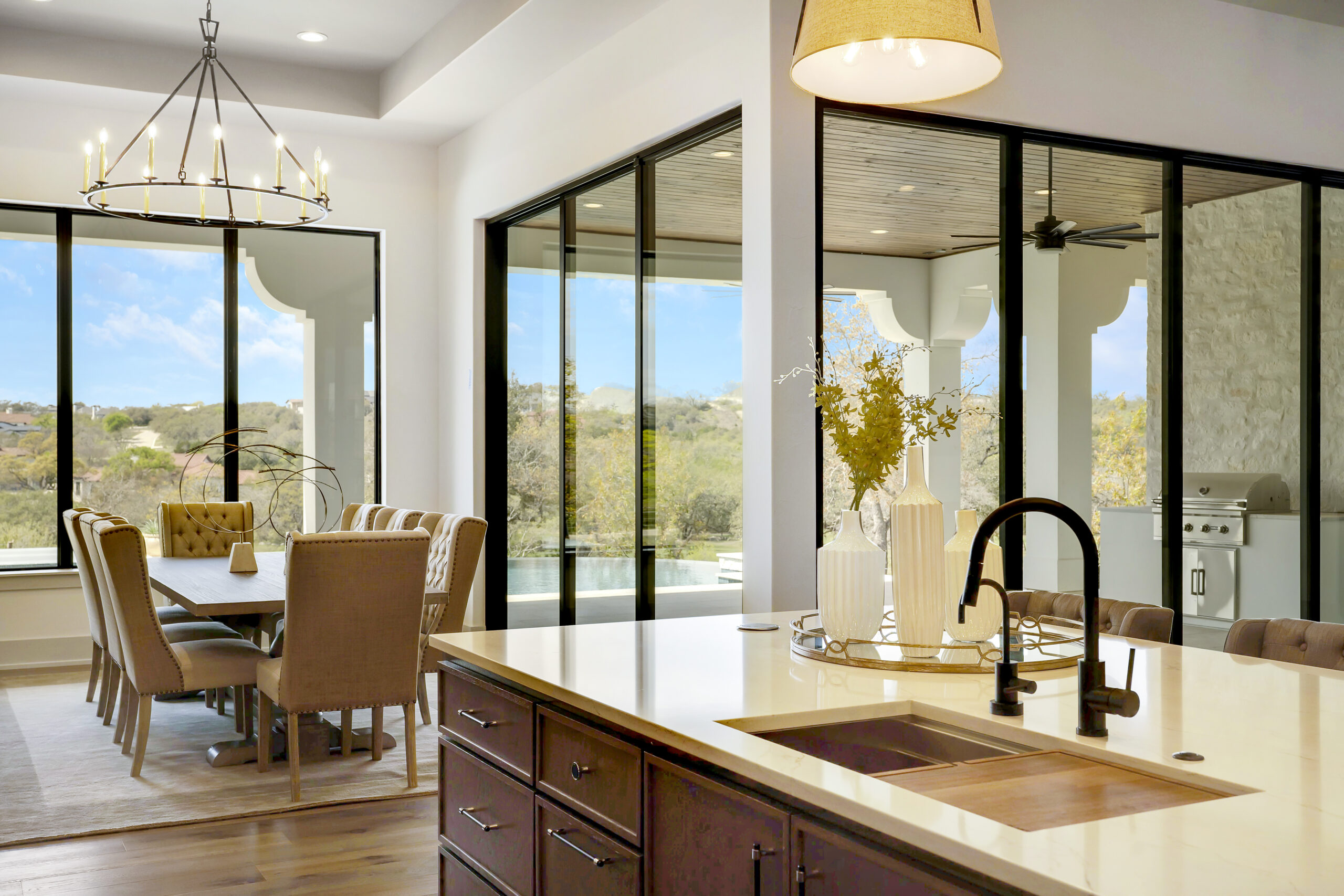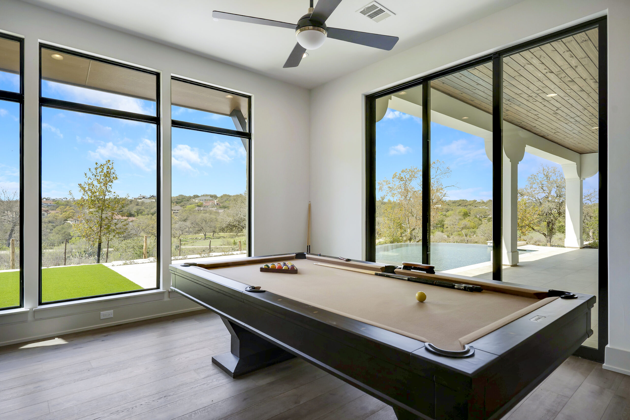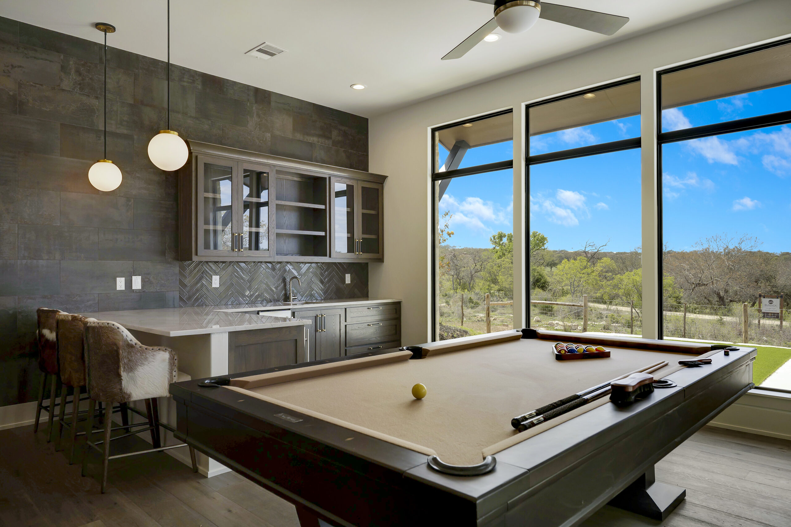 Situated on the 12th fairway of the Jack Nicklaus Signature golf course in the highly desired Texas Hill Country community of Cordillera Ranch, this transitional Santa Barbara home exudes the ultimate in luxury living. The sprawling one story design on just over an acre features 5,075 square feet of living space offering 4 bedrooms with ensuite baths, a study and an oversized game room with wet bar. The primary suite is tucked away for optimal privacy. The primary bath promotes rest and relaxation with the spa like shower, freestanding tub situated next to a cozy fireplace and a custom closet with adjustable rods and built in drawers. The gourmet kitchen will inspire anyone to cook or entertain. SubZero/Wolf appliances and custom cabinetry wrap around into a caterer's kitchen with a second sink, dishwasher and space for a secondary refrigerator. The open great room, dining and game room invite indoor/outdoor living with expansive glass doors while overlooking the back yard and pool. A powder/pool bath is also conveniently located with patio access. The tiled covered patio includes a built in gas grill and plenty of space for outdoor gathering. The negative edge pool with elevated hot tub and sun shelf features a fantastic sitting area below to take advantage of the amazing golf course and sunset views! The flex room would make an ideal exercise room or second office. The utility room includes ample cabinets for storage along with a sink and desk area. A mud bench is conveniently located just outside on the way to the 3 car garage. A separate 4th car garage is perfect for the toys and tools or could easily be converted to a guest suite. An amazing opportunity.
