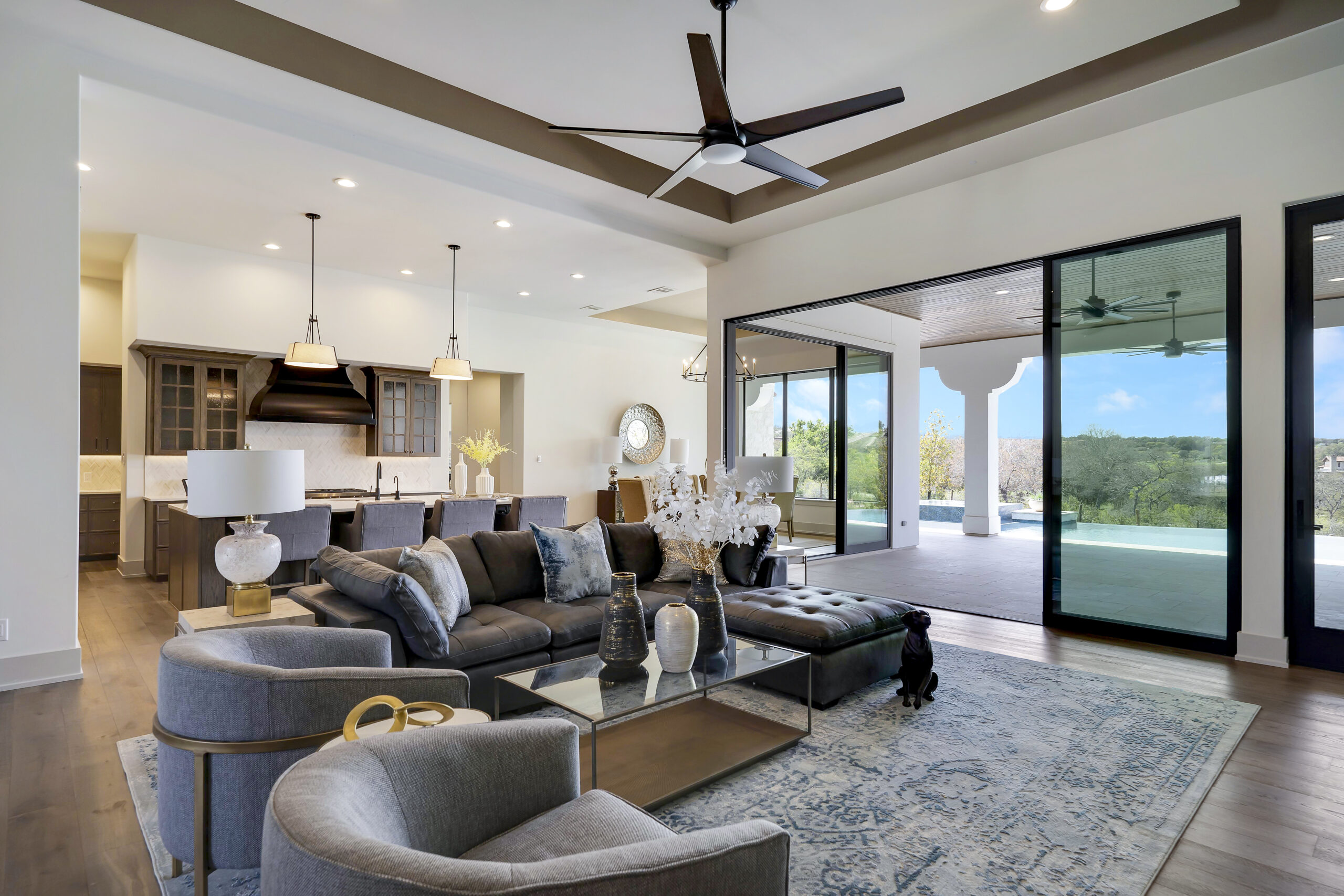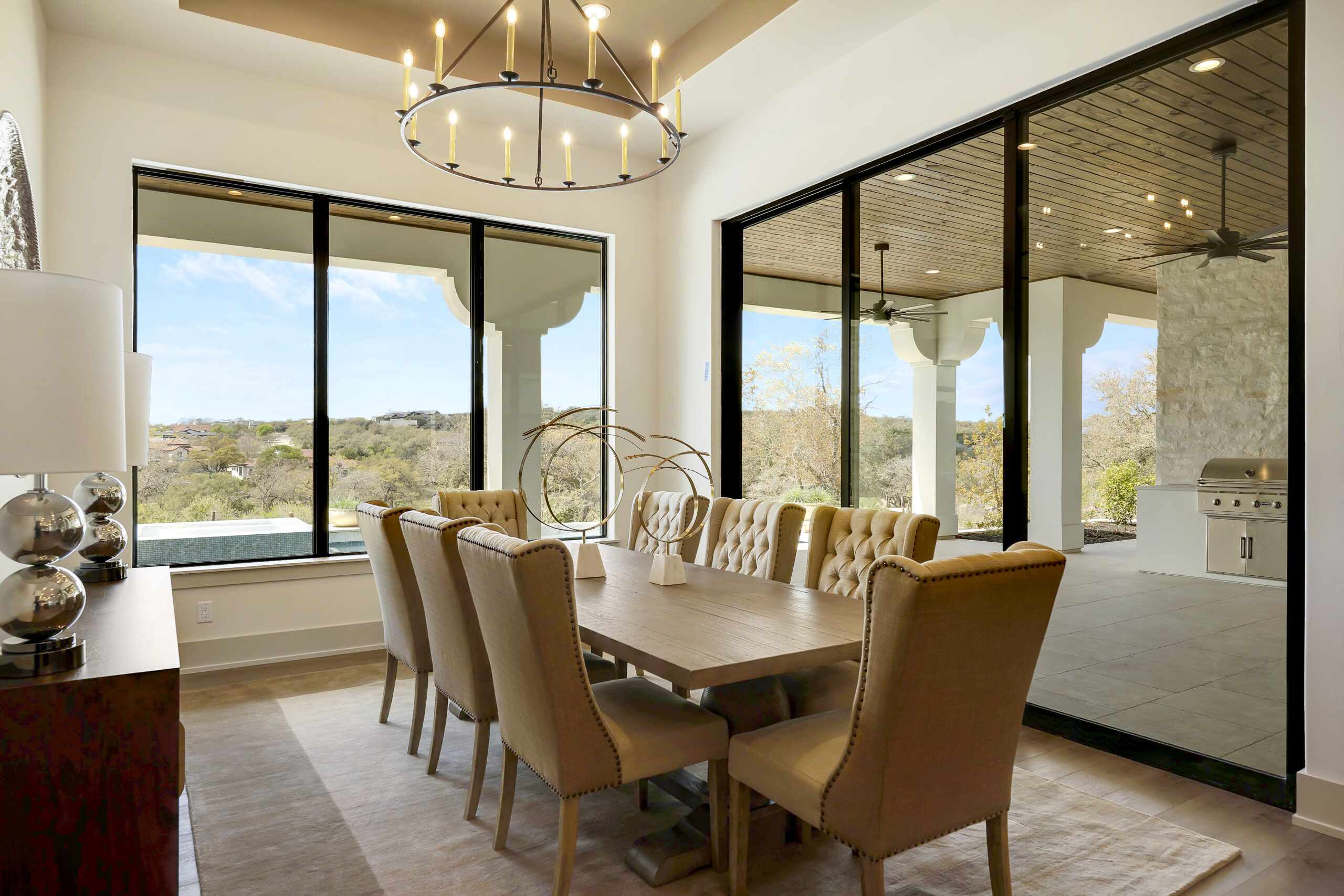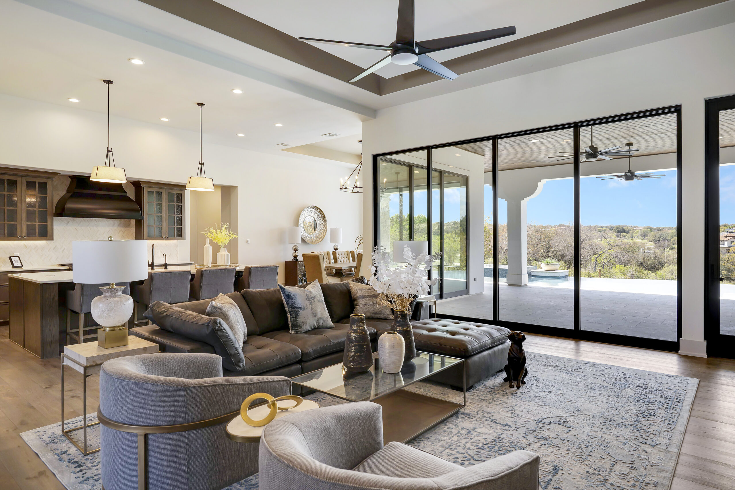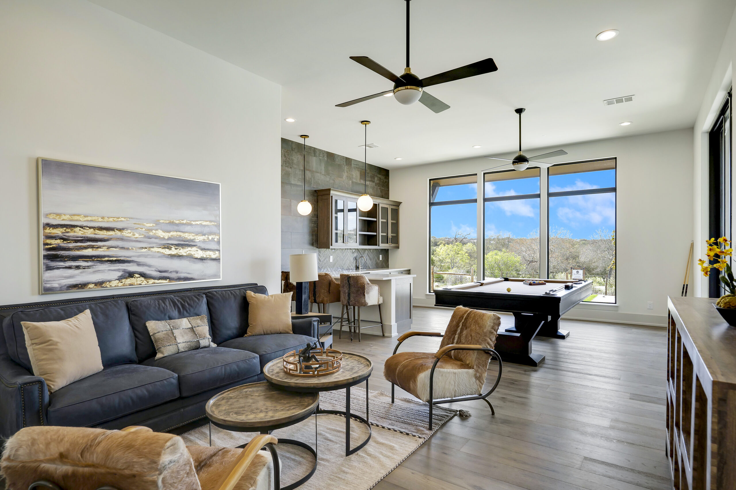 Situated on the 12th fairway of the Jack Nicklaus Signature golf course in the highly desired Texas Hill Country community of Cordillera Ranch, this transitional Santa Barbara home exudes the ultimate in luxury living. The sprawling one story design on just over an acre features 5,075 square feet of living space offering 4 bedrooms with ensuite baths, a study and an oversized game room with wet bar. The primary suite is tucked away for optimal privacy. The primary bath promotes rest and relaxation with the spa like shower, freestanding tub situated next to a cozy fireplace and a custom closet with adjustable rods and built in drawers. The gourmet kitchen will inspire anyone to cook or entertain. SubZero/Wolf appliances and custom cabinetry wrap around into a caterer's kitchen with a second sink, dishwasher and space for a secondary refrigerator. The open great room, dining and game room invite indoor/outdoor living with expansive glass doors while overlooking the back yard and pool. A powder/pool bath is also conveniently located with patio access. The tiled covered patio includes a built in gas grill and plenty of space for outdoor gathering. The negative edge pool with elevated hot tub and sun shelf features a fantastic sitting area below to take advantage of the amazing golf course and sunset views! The flex room would make an ideal exercise room or second office. The utility room includes ample cabinets for storage along with a sink and desk area. A mud bench is conveniently located just outside on the way to the 3 car garage. A separate 4th car garage is perfect for the toys and tools or could easily be converted to a guest suite. An amazing opportunity.